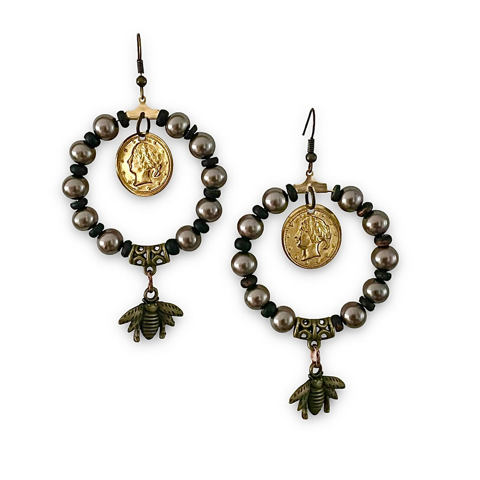 Coffee Pearl Hoops with Fleur di Lis Dangles